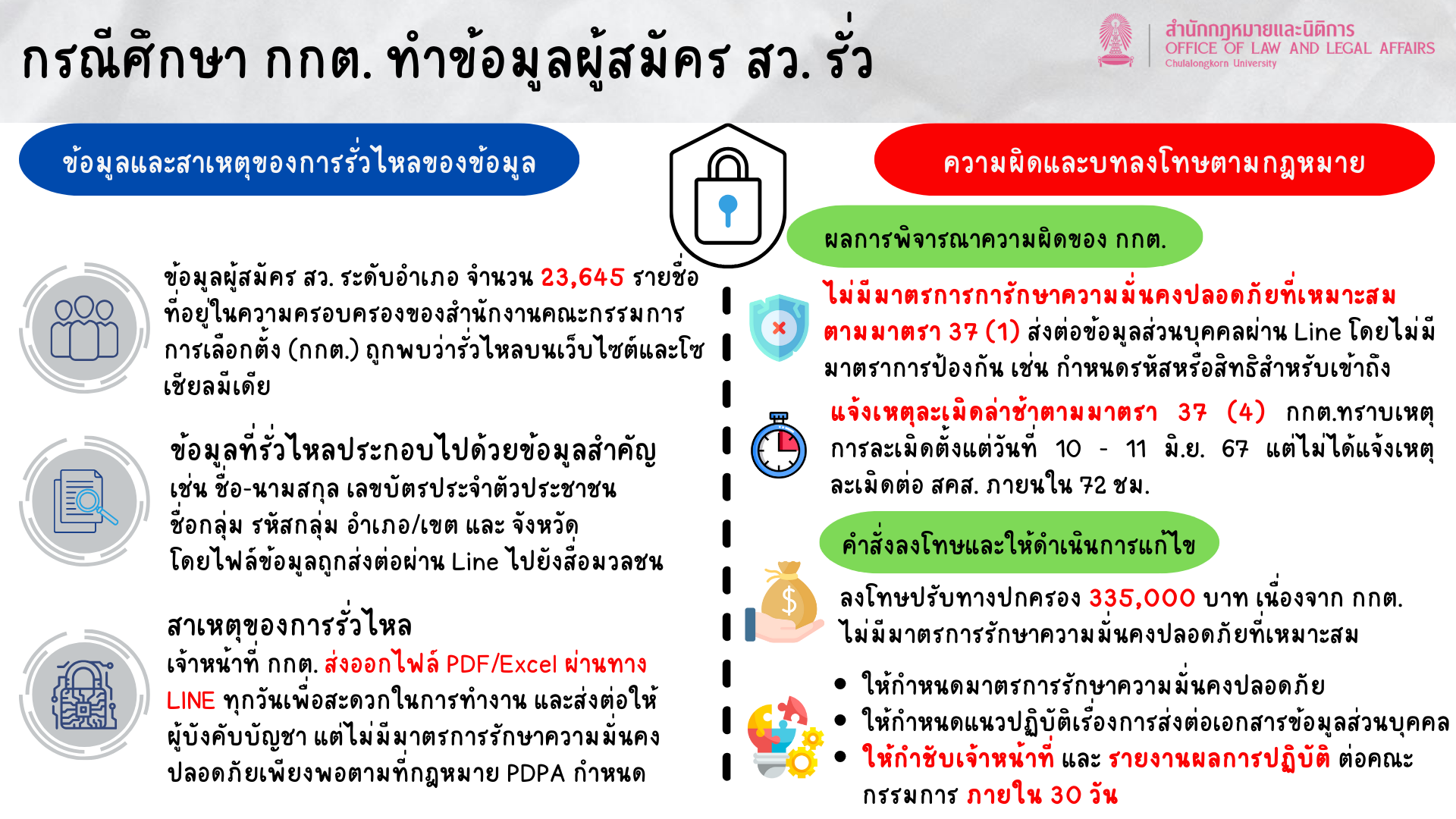 คณะกรรมการผู้เชี่ยวชาญฯ วินิจฉัยว่า กกต.ฝ่าฝืนพระราชบัญญัติคุ้มครองข้อมูลส่วนบุคคล พ.ศ. 2562 (PDPA) ใน 2 ประเด็น ได้แก่ การจัดให้มีมาตรการรักษาความมั่นคงปลอดภัยไม่เหมาะสม ตามมาตรา 37 (1) เนื่องจากการส่งไฟล์ข้อมูลส่วนบุคคลที่มีความละเอียดอ่อนผ่าน LINE โดยไม่มีมาตรการป้องกันใดๆ ถือเป็นการขาดความระมัดระวังและไม่เป็นไปตามมาตรฐานขั้นต่ำที่กฎหมายกำหนด จึงสั่งปรับเป็นเงิน 335,000 บาท และประเด็นที่สอง คือ การแจ้งเหตุละเมิดล่าช้า ตามมาตรา 37 (4) โดยแม้ กกต.จะทราบเหตุตั้งแต่วันที่ 10-11 มิถุนายน 2567 แต่ไม่ได้แจ้งเหตุการละเมิดแก่สำนักงานคณะกรรมการคุ้มครองข้อมูลส่วนบุคคล (สคส.) อย่างเป็นทางการภายใน 72 ชั่วโมง โดยแจ้งเป็นทางการเมื่อวันที่ 21 มิถุนายน 2567 ซึ่งเกินกำหนด อย่างไรก็ตาม คณะกรรมการฯ พิจารณาลดหย่อนโทษในประเด็นนี้เหลือเพียงตักเตือน เนื่องจาก กกต.ให้ความร่วมมือดีและระงับเหตุได้ทันท่วงที